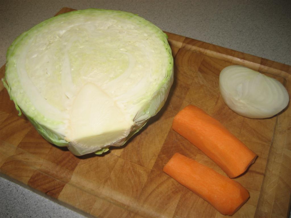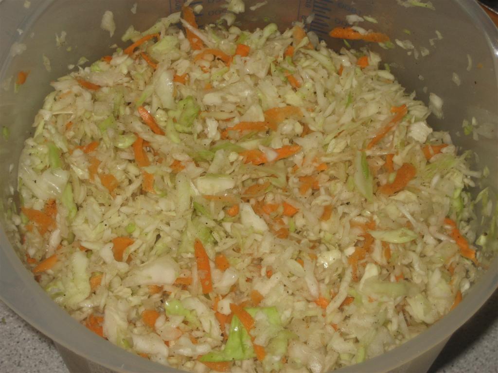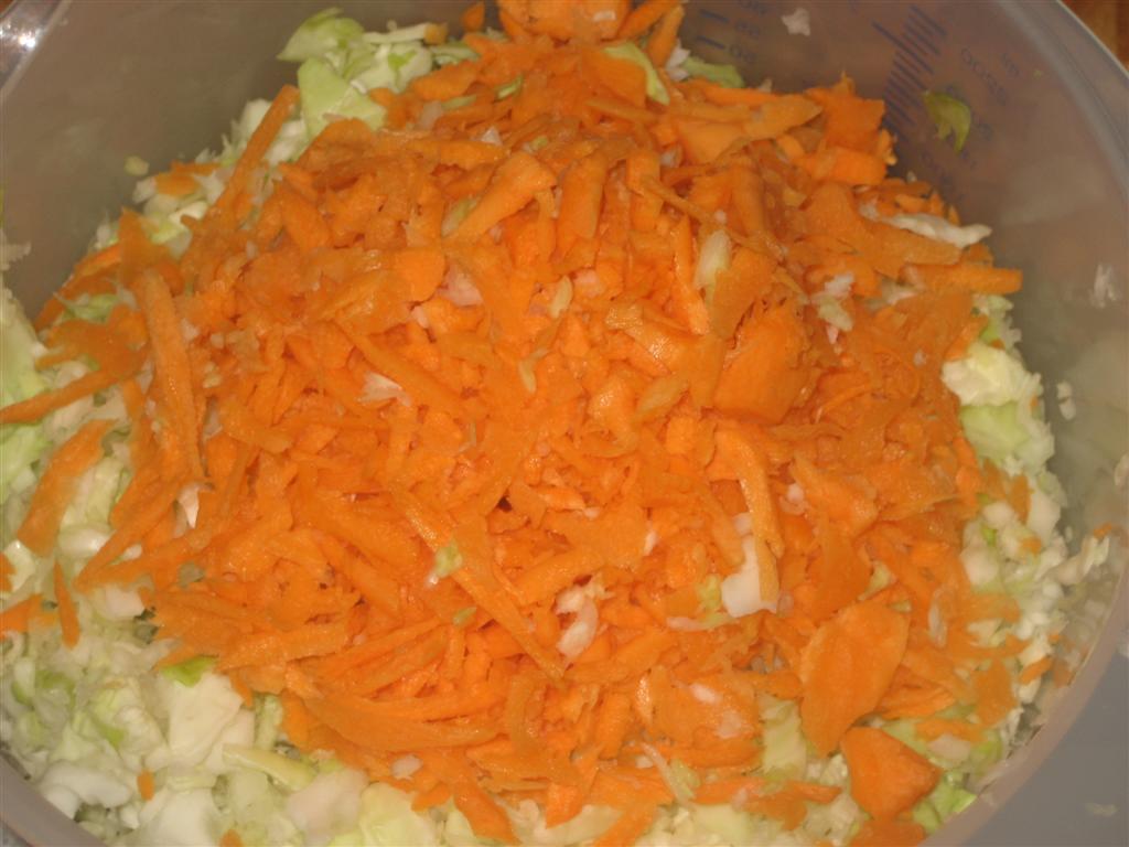 - Egy fél fej káposztát reszelj le, egy szál kisebb sárgarépát, vagy egy fél nagyobbat szintén reszelj le, vágj apróra egy fél fej hagymát.