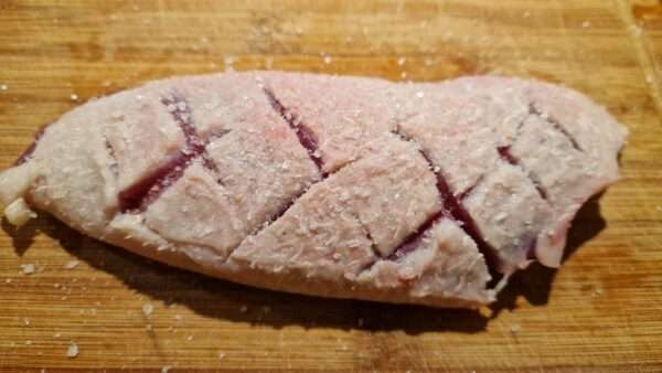 - Irdald be óvatosan a kacsamellek bőrét úgy, hogy a húsba ne vágj bele. Sózd és borsozd a melleket mindkét oldalukon.